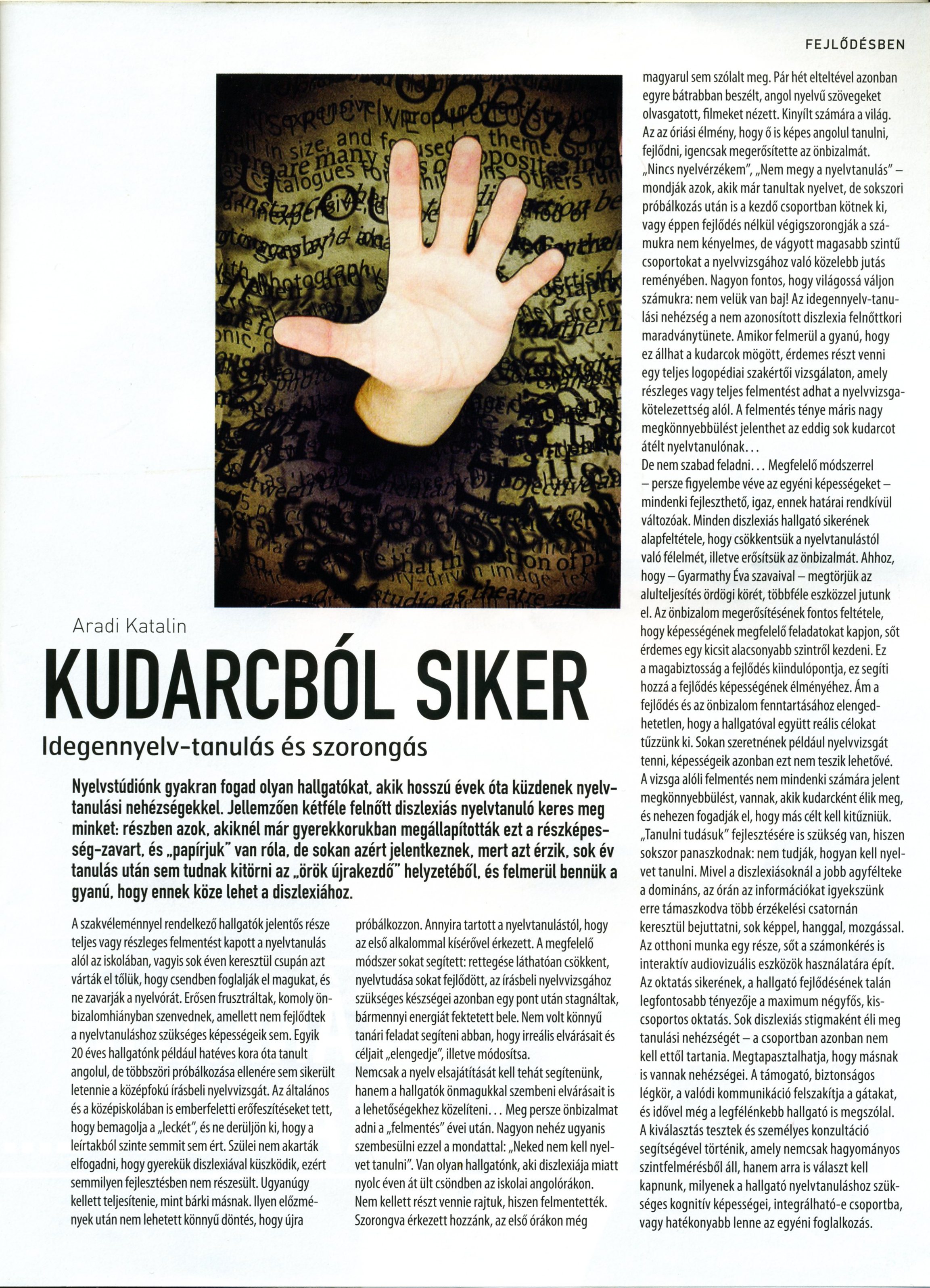 Nemcsak a nyelv elsajátítását kell tehát segítenünk, hanem a hallgatók önmagukkal szembeni elvárásait is a lehetőségekhez közelíteni… Meg persze önbizalmat adni a „felmentés” évei után. Nagyon nehéz ugyanis szembesülni ezzel a mondattal: „Neked nem kell nyel¬vet tanulni”. Van olyan hallgatónk, aki diszlexiája miatt nyolc éven át ült csöndben az iskolai angolórákon. Nem kellett részt vennie rajtuk, hiszen felmentették. Szorongva érkezett hozzánk, az első órákon mégmagyarul sem szólalt meg. Pár hét elteltével azonban egyre bátrabban beszélt, angol nyelvű szövegeket olvasgatott, filmeket nézett. Kinyílt számára a világ. Az az óriási élmény, hogy ő is képes angolul tanulni, fejlődni, igencsak megerősítette az önbizalmát.